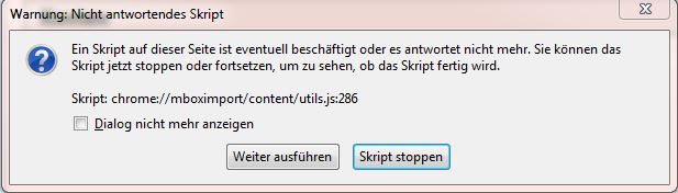 Damit waren die beiden Methoden gemeint, mit denen ich die Mbox Dateien wiederherstellen wollte. Zum Einen das einfache Kopieren in den entsprechenden Ordner vom neu angelegten E-Mail Konto, was recht flott ging, aber keinerlei Ergebnisse (bis auf einen leeren Ordner mit dem Namen Inbox) geliefert hat. Zum Anderen die Methode über das ImportExportTool, was dann ewig lang nicht reagiert hat, die Meldung eines Skriptfehlers brachte und dann aufhörte.