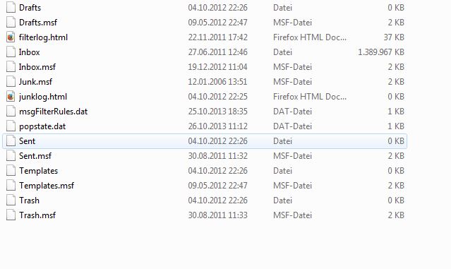 Leider habe ich in den anderen Konten keine kleinen Mbox Dateien. Lediglich im "Local Folders" ist ein "Inbox" Unterordner, in dem für jeden meiner Ordner eine eigene Mbox Datei ist.