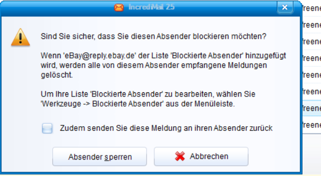 Über die rechte Maustaste bei IM auf die eingeganene Mail und auswählen "Kontakt blockieren" erscheint das Fenster das ich als Screen beifüge.