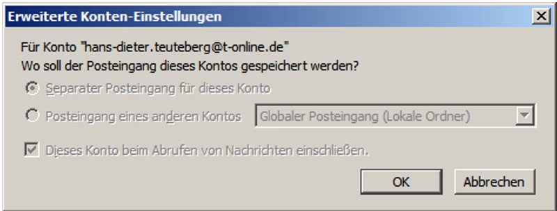 Nach vielem Experimentieren läuft es jetzt. Ich wundere mich übrigens, wie wenige Leute hier anscheinend Auskunft über den "Globalen Posteingang" geben können. Und ich vermute stark, daß da schon etliche Laien-User dran gescheitert sind.