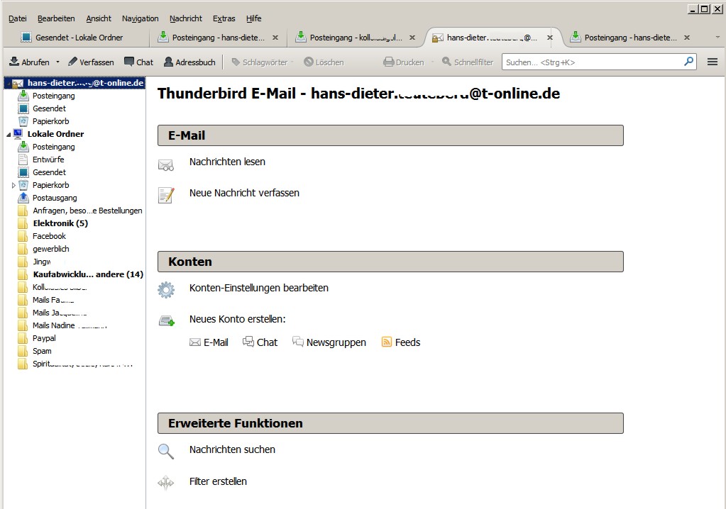 Nur wenn ich Thunderbird schließe und wieder öffne, sind die Mail-Konten links verschwunden. Das passierte übrigens schon beim Einrichten eines neuen Mail-Kontos. Immer wenn das neue eingerichtet wurde, verschwand das davor eingerichtete. Unter Extras, Konten-Einstellungen sind aber alle Konten noch aufgeführt.