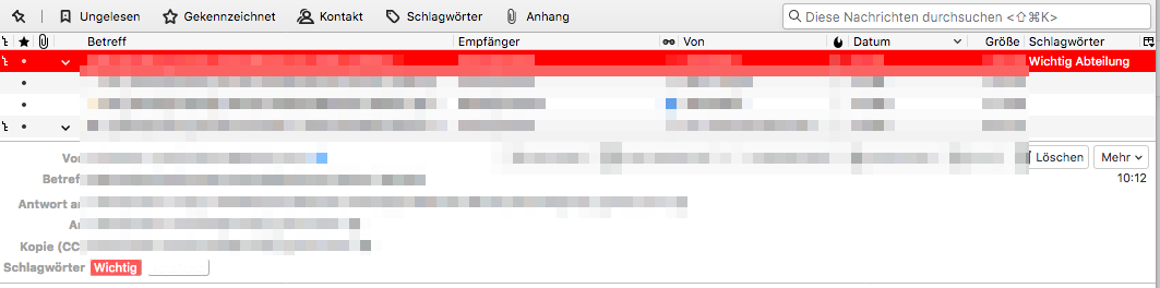 In der Mailansicht sind - wenn überhaupt - nur die SW, die farblich unterlegt sind, zu lesen (Text ist weiß). SW, die keiner Farbe zugewiesen sind, sind nicht lesbar, auch wenn ein weißes Kästchen für das SW sichtbar ist. Ich vermute, dass das daran liegt, dass der Text des Schlagwortes wie bei den farbigen SW weiß ist und deswegen nicht sichtbar. Aber wie ändert man das und wer kam auf die Idee, den Text in farbigen SW weiß darzustellen?