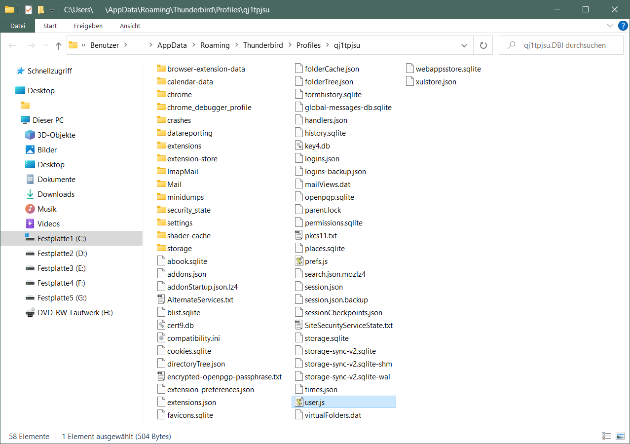 Code// für CSS // muß auf true gesetzt sein damit CSS in Thunderbird funktioniert user_pref("toolkit.legacyUserProfileCustomizations.stylesheets", true); // Devtools // 3Strich -> Werkzeuge -> Entwicklerwerkzeuge // Hinweisfenster - aus user_pref("devtools.debugger.prompt-connection", false);alles andere nach bedarf selbst einfügen