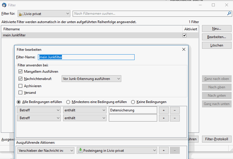 Soeben habe ich wieder das Phänomen entdeckt: Mails landen im Junkordner (Filter ist immer noch deaktiviert), markieren als Kein Junk, sie gehen direkt in den Eingangsordner und werden dort als 'nicht gelesen' markiert. Nach 15 Minuten verschwinden sie wieder im Junkordner. Das ist doch nicht normal. Da sitzt doch ein Geist im Innern. Ich bin bald am Verzweifeln.