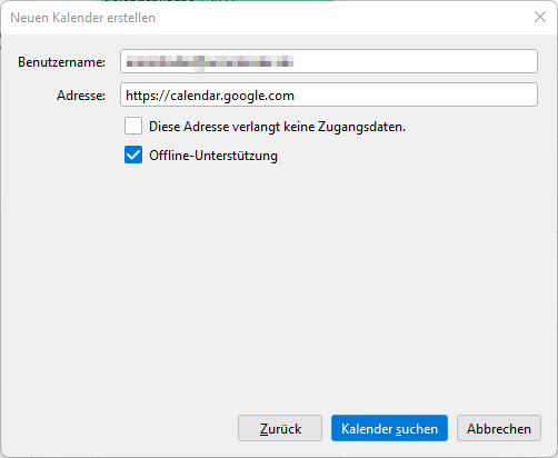 Mit meiner E-Mail Adresse als Benutzername und der Netzwerkadresse "https://calendar.google.com" konnte ich den Button "Kalender suchen" benützen ...