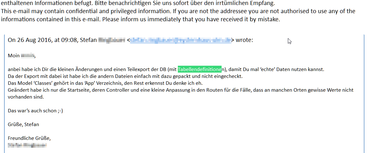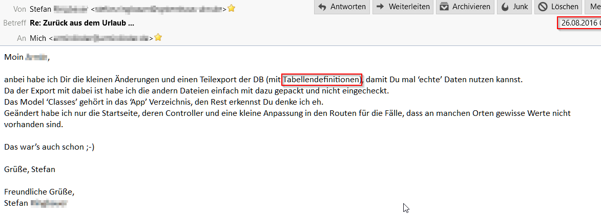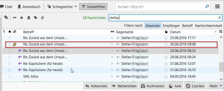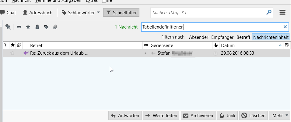 Wers genauer ansehen möchte: in den angehängten Screenshots ist das Problem genau dokumentiert. Man achte genau auf die Mail vom 26.8., das ist die, welche übergangen wird. Außer mit dem dokumentierten Suchwort "Tabellendefinitionen" (welches mir besonders prägnat erschien um das Problem zu demonstrieren) habe ich auch noch x andere im Text vorkommende Wörter versucht, darunter auch "Controller" oder den Namen "Stefan" der gleich x Mal vorkommt - diese Mail wurde per Filter nach Nachrichtentext in keinem einzigen Fall gefunden.