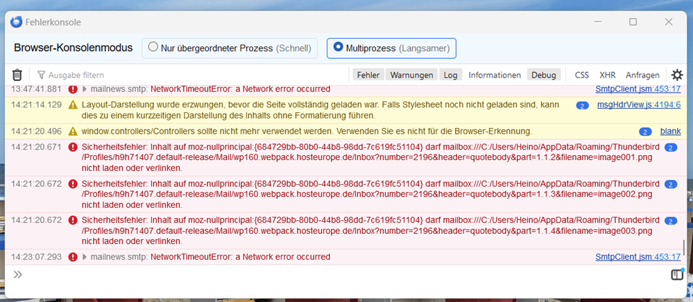 nach dem Update auf Thunderbird 102.3.0 bekomme ich beim Arbeiten ab und zu einen White Screen - d.h. es geht nichts mehr, neu starten am PC ist erforderlich. Booten im abgesicherten Modus und Virenprogramm etc habe ich gemacht, auch Virenscan mit externem Programm. Alles in Ordnung. Passiert auch nach kurzer Arbeitszeit, z.B. eine Stunde. PC ist nicht zu heiß. Sonst habe ich nichts verändert (keine neuen Programme, keine neuen externen Geräte).
