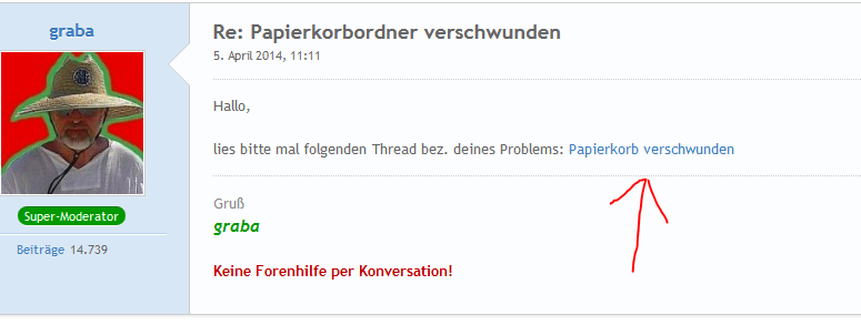 ich habe zu meinem Beitrag 'Papierkorb verschwunden' zweimal eine Antwort geschrieben (mit Dateianhang), die aber im Thread nicht erschien.