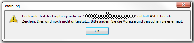 "Der lokale Teil der Empfängeradresse "info@xxxxx.de " enthält ASCII-fremde Zeichen. Dies wird noch nicht unterstützt. Bitte ändern Sie die Adresse und versuchen Sie es erneut."