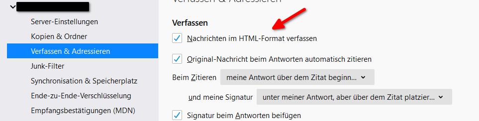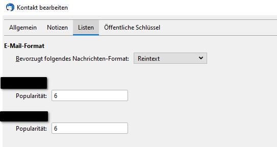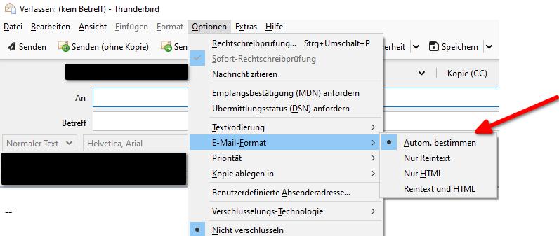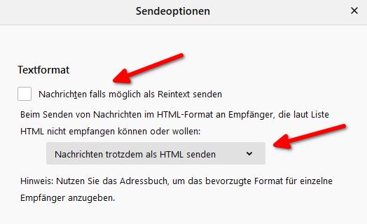 Listen/Bevorzugt folgendes Nachrichten-Format: Unbekannt/Reintext/HTMLWenn hier "Reintext" eingetragen ist, steigt die Wahrscheinlichkeit, dass TB die Mail als Reintext verschickt. Allerdings auch nicht immer.