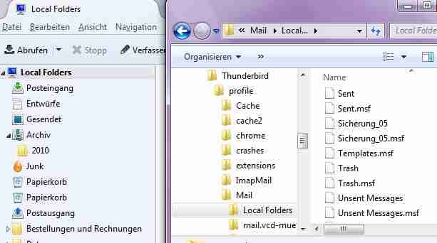 Hallo, bei mir sieht es eben so aus (Links TB, rechts Win Explorer). Sicherung_05 ist der umbenannte Trash aus meinem Backup. Natürlich ist der nicht leer, wie oben unterstellt wurde. Er wird von TB als 2. Papierkorb angezeigt, beim Start werden "abgelaufene" Mails gelöscht. Mails, die ich jetzt lösche, wandern in den "oberen Papierkorb". Aber wie erwähnt, die gesuchte Mail habe ich bereits mit einem Editor in Sicherung_05 wieder gefunden. Liebe Grüße, JoKi
