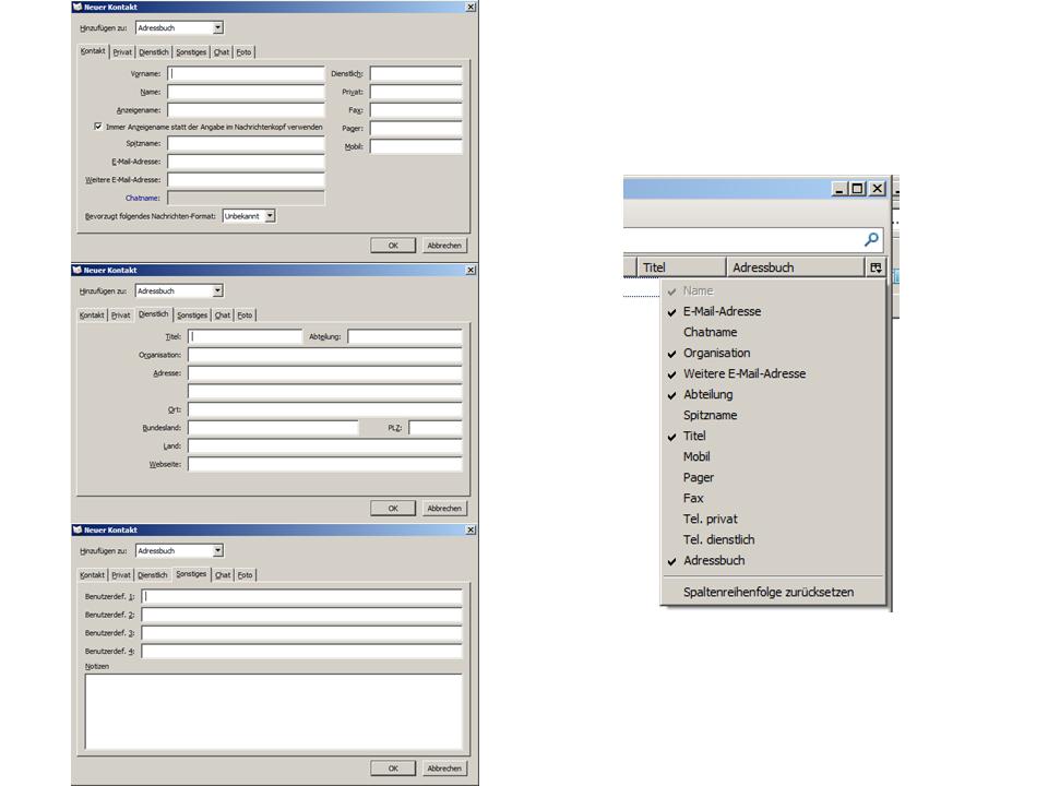 Bei meinem bisherigen E-Mail-Programm (habe Thunderbird erst seit wenigen Tagen, bisher T-Online-E-Mail-Browser 6) hat mich das "- -" auch schon gestört, aber das Löschen hat nicht zu einem Zusammenschieben der Kontaktdaten geführt. Das ist leider als lästiger "Fortschritt" hinzugekommen.