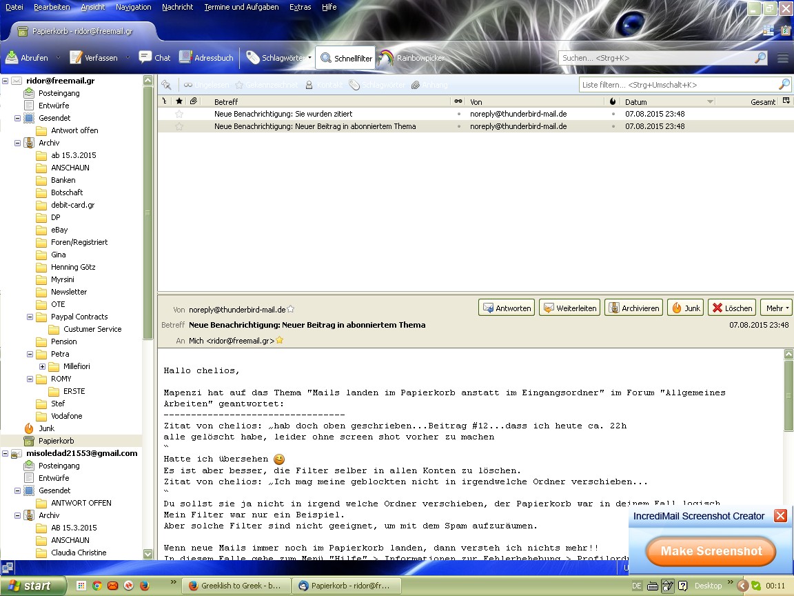 Und genau diese mails landen im jeweiligen TB-Papierkorb, kann deren Anhänge nicht aufmachen, ohne Junk-Kennzeichnung, mein Junk funktioniert, UND scheinen im web-mail-konto überhaupt nicht auf. D.h. TB grapscht sich "irgendwelche" mails, für die es gar keinen Filter gibt, schmeisst sie in den Papierkorb, und löscht sie damit auch aus dem web-Konto!!!???