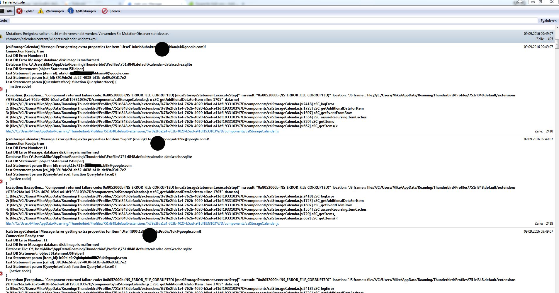 In den Aktivitäten werden auch die Syncro-versuche abgezeigt, aber halt ständig und immer und die scheinen nicht fertig zu werden. Desweiteren habe ich in der Fehlerkonsole was entdeckt, was auf die Kalender zu deuten scheint, allerdings bin ich da komplett überfordert.