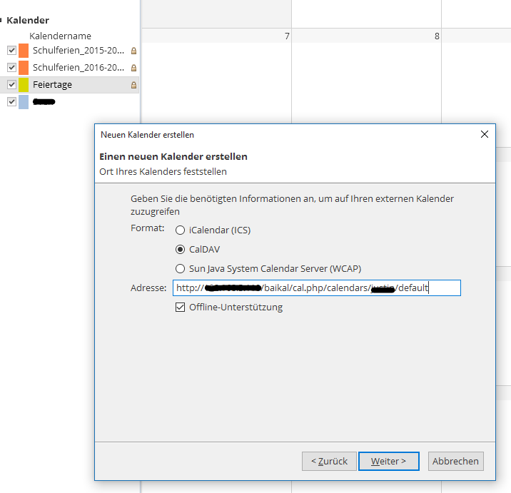 ich möchte gerne das Lightning Add-on zum abrufen für mehrere caldav Kalender über einen Server Synology DS214+ mit Baikal einstellen. Leider klappt das irgendwie nicht. Ich habe es mit unseren Android Handys und Apples Ipad sofort hinbekommen. Dort synct auch alles richtig. Nun habe ich einen Kalender eingegeben, wurde dann auch nach dem Benutzernamen und Passwort gefragt und der Kalender lief sogleich. Jetzt sollte der zweite Kalender folgen. Also flugs die gleichen Daten eingegeben, siehe da, keine Abfrage des BN und PW , hinter dem Eintrag erscheint ein gelbes Dreieck. Ich habe auch schon heute den ganzen Tag gelesen und probiert, nichts hat geholfen. Bin jetzt echt am Ende und hab keine Idee mehr. Wer kann helfen?