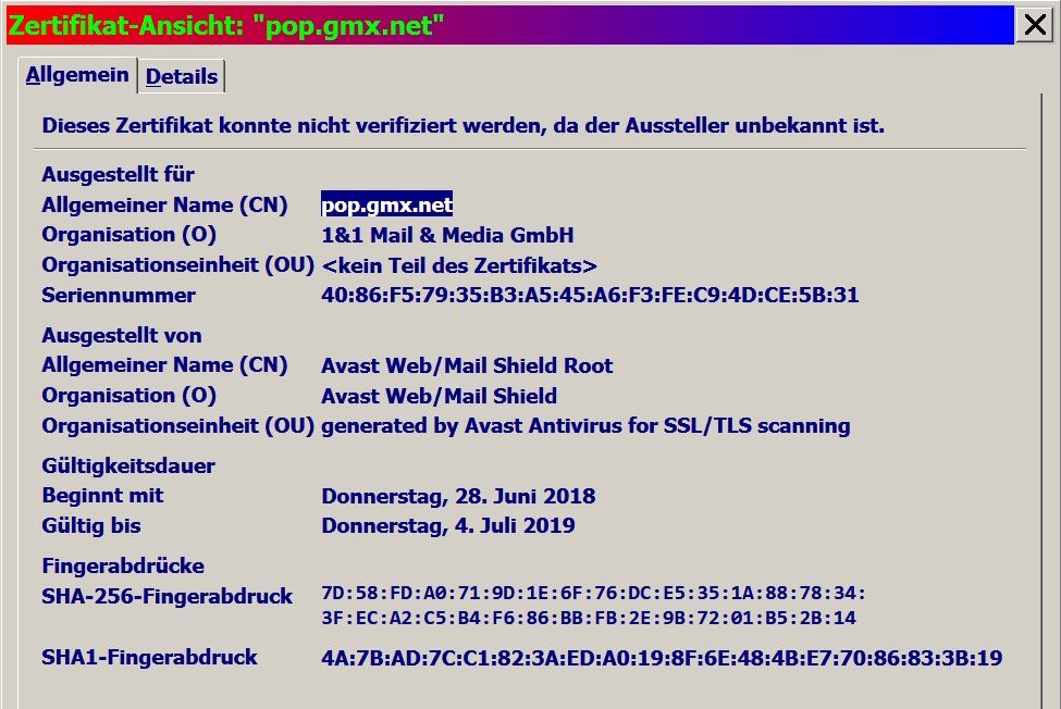 Das E-Mail-Schutz-Zertifikat hab ich bereits aus dem Avast in einem Ordner abgespeichert, aber wo implementier ich das bei TB?? Wenn ich unter Einstellungen > Erweitert > Zertifikate verwalten das importieren will, kommt die Meldung, daß es bereits installiert ist.....