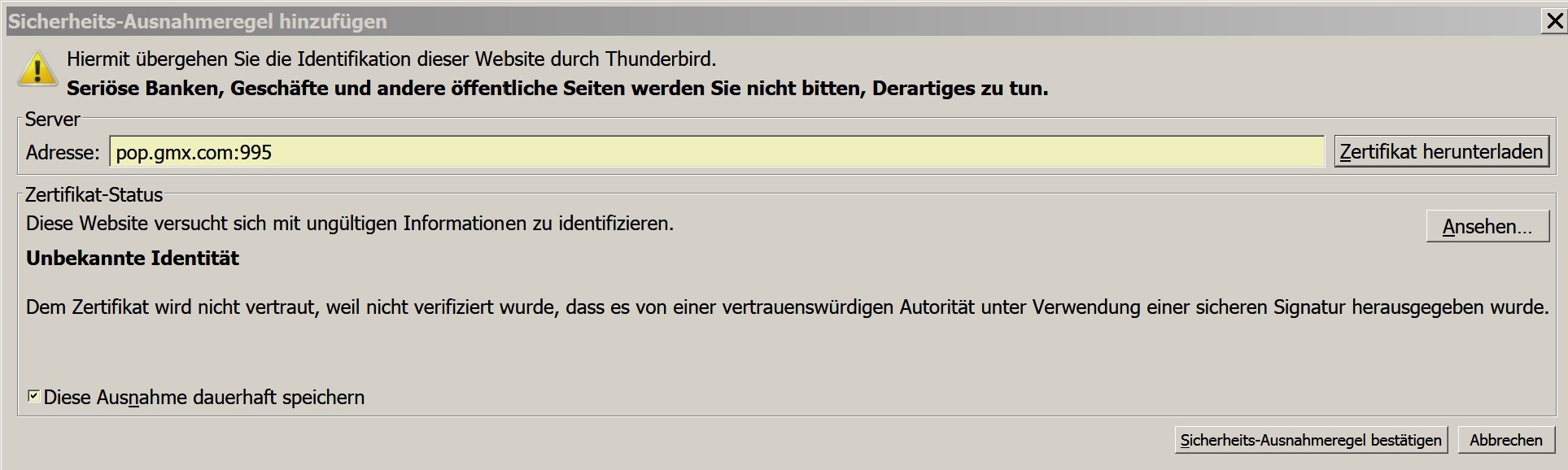 Auf "Ausnahme dauerhaft speichern" klicken nützt leider nix, das kommt bei jedem mal mails abfragen...