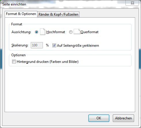 Unter "Datei" -> "Seite einrichten" unter "Format & Optionen" kann ich lediglich die Ausrichtung (Quer/Hoch) und die Skalierung einstellen.