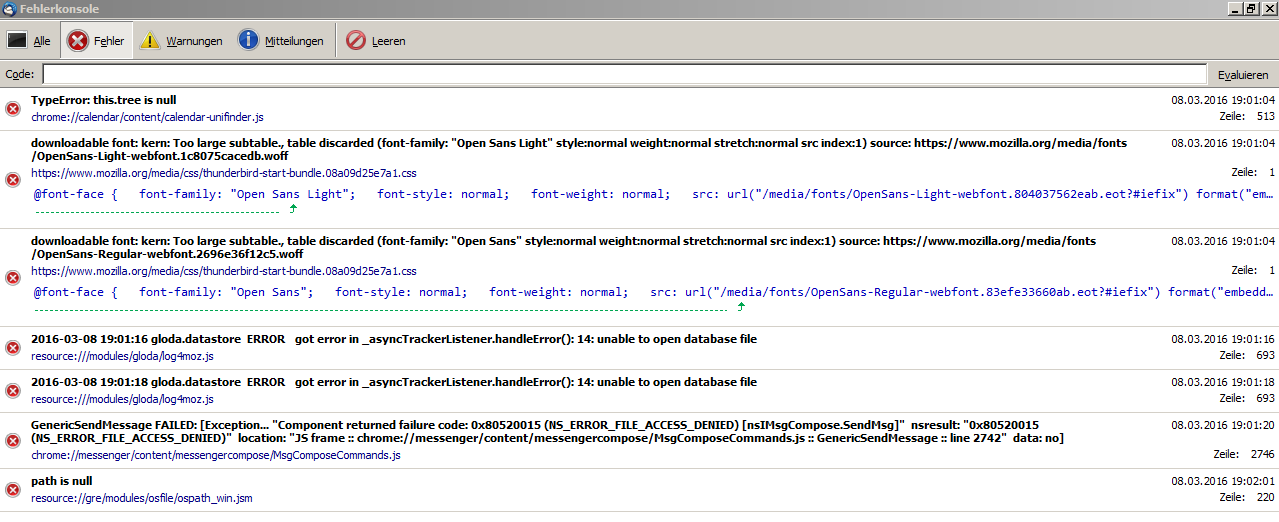 CodeFehler: GenericSendMessage FAILED: [Exception... "Component returned failure code: 0x80520015 (NS_ERROR_FILE_ACCESS_DENIED) [nsIMsgCompose.SendMsg]" nsresult: "0x80520015 (NS_ERROR_FILE_ACCESS_DENIED)" location: "JS frame :: chrome://messenger/content/messengercompose/MsgComposeCommands.js :: GenericSendMessage :: line 2742" data: no] Quelldatei: chrome://messenger/content/messengercompose/MsgComposeCommands.js Zeile: 2746 Fehler: 2016-03-08 19:26:54 gloda.datastore ERROR got error in _asyncTrackerListener.handleError(): 14: unable to open database file Quelldatei: resource:///modules/gloda/log4moz.js Zeile: 693