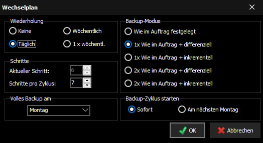 Für die Voll-Sicherung am Montag werden etwa 90 Minuten für meinen 35 GB großen Profilordner benötigt. An den restlichen Tagen ist die differenzielle Sicherung nach 2 bis 10 Minuten fertig. Benötigter Speicherplatz für die rotierende 7-Tage Sicherung etwa 50 GB.