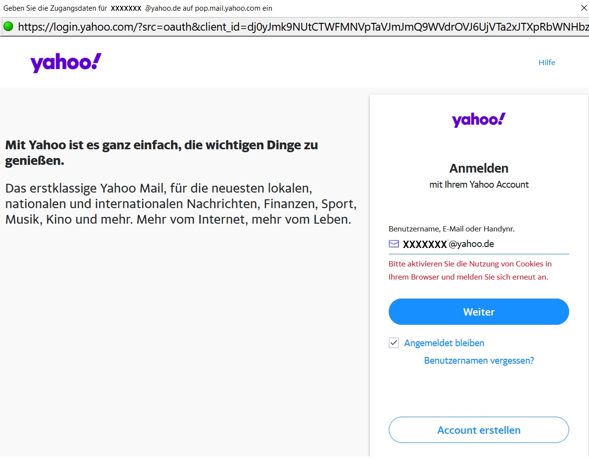 Wenn ich dann auf "Fertig" klicke, kommt ein Fenster von yahoo, in dem ich mich anmelden soll.