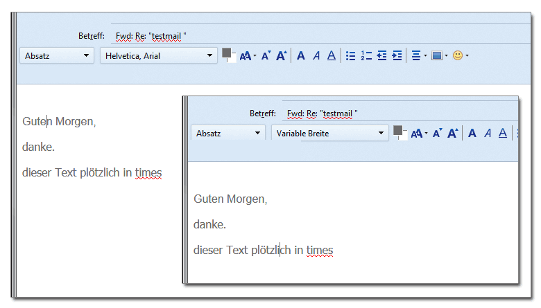 Beim Erstellen einer Mail wechselt Thunderbird von sich aus den Schrifttyp. Zunächst einmal ohne dass ich davon etwas bemerke. Die Schriften werden im Editor normal und einheitlich angezeigt. Erst wenn der Mailempfänger auf meine Mail antwortet sehe ich, dass in meiner Ursprungsmail der Text zeilenweise in times erscheint. Schaue ich mir meine gesendete Mail genauer an, ist zu erkennen, dass diese Schriften unterschiedlich formatiert sind (siehe Schriftmarke in screenshot- "variable Breite" kommt beim Empfänger in times an) obwohl, wie auch zu sehen ist, die Schrifttypen im editor nicht unterschiedlich sind.Ich kann keine Ursache erkennen, wann TB die Schritttype ändert. Also kann es nicht simulieren.