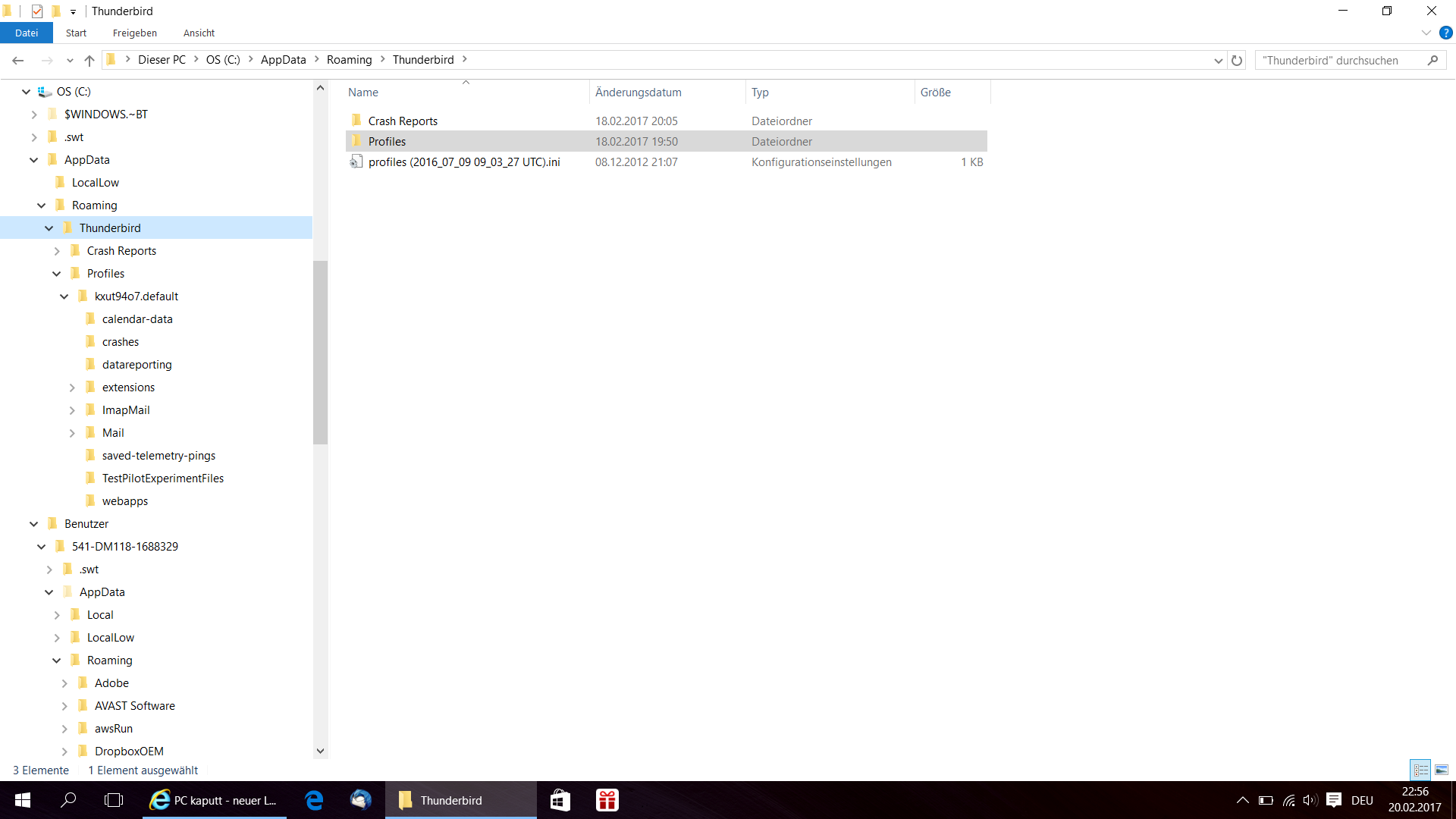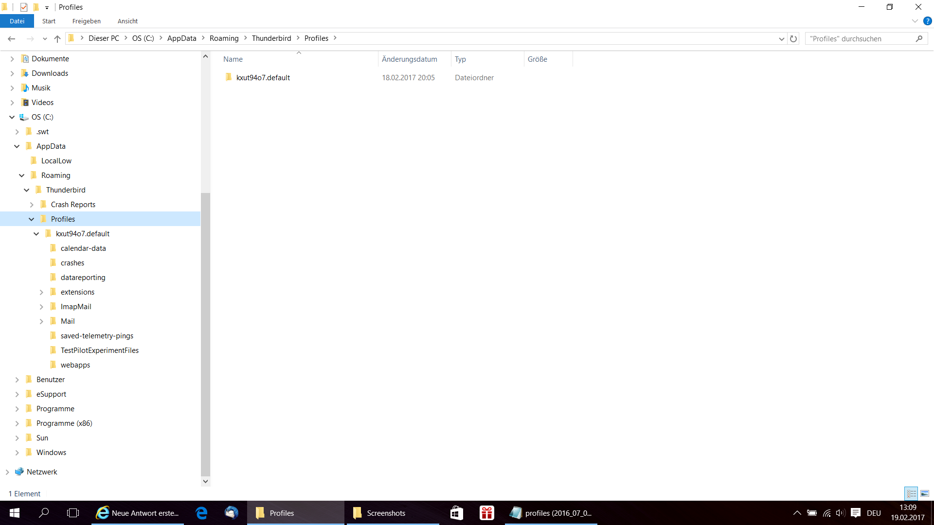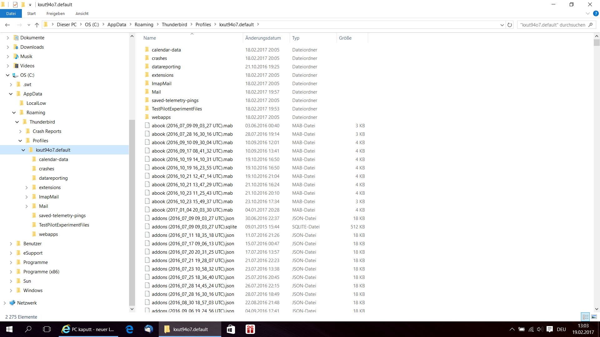 Ich habe den kompletten Thunderbird Ordner gesichert und eingefügt, siehe Screen shots vom neuen Laptop. Es scheint jedenfalls, als hätte Thunderbird nach dem Download die Ordner gefunden, da bei einigen Ordner ja das Datum von gestern (18.02.2017) angezeigt wird. Thunderbird will aber von mir, dass ich meine e-mail Konten einrichte.... also irgend etwas erkennt er nicht.