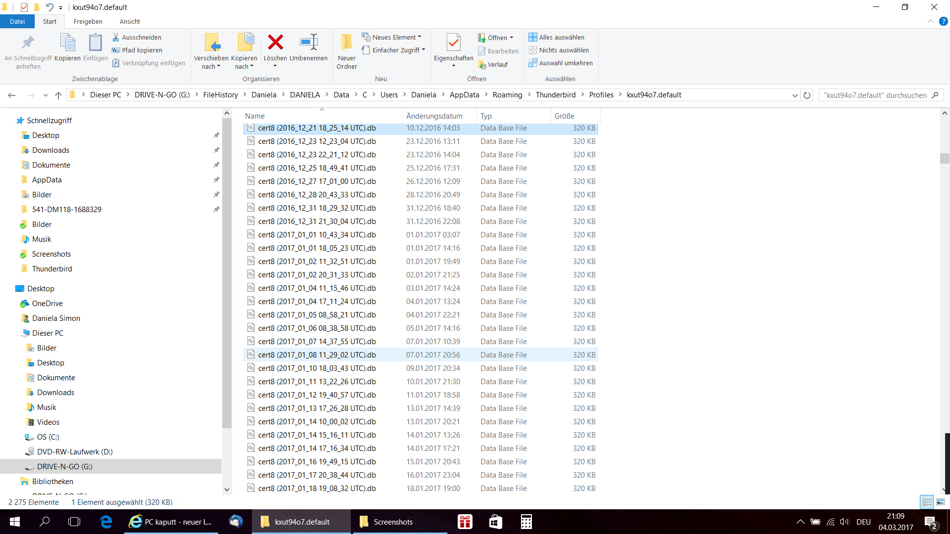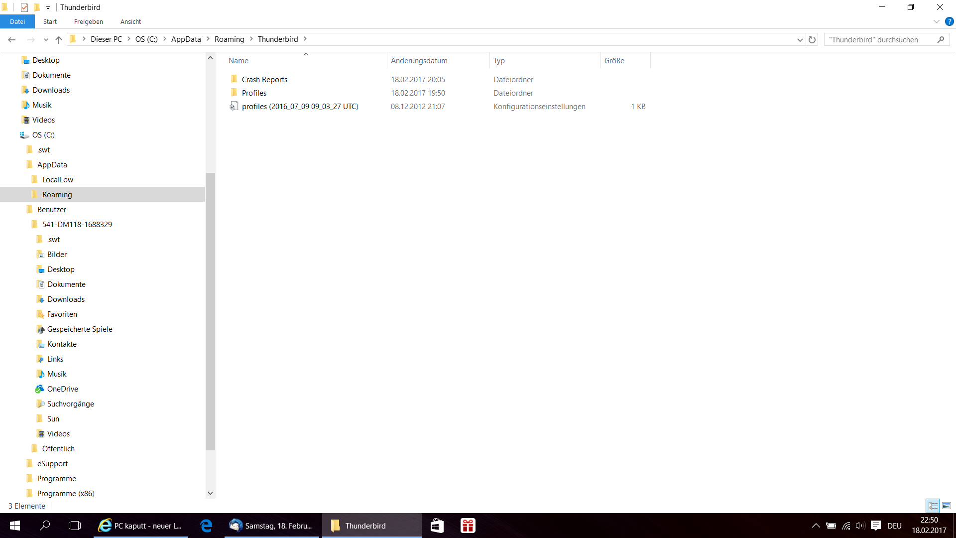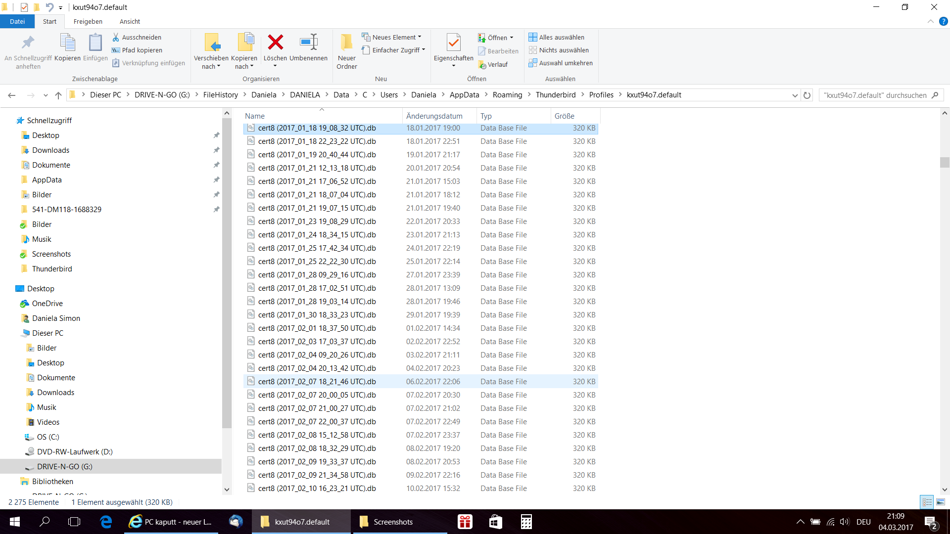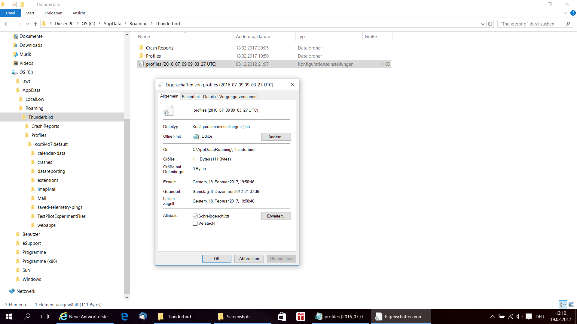 Ich habe den kompletten Thunderbird Ordner gesichert und eingefügt, siehe Screen shots vom neuen Laptop. Es scheint jedenfalls, als hätte Thunderbird nach dem Download die Ordner gefunden, da bei einigen Ordner ja das Datum von gestern (18.02.2017) angezeigt wird. Thunderbird will aber von mir, dass ich meine e-mail Konten einrichte.... also irgend etwas erkennt er nicht.