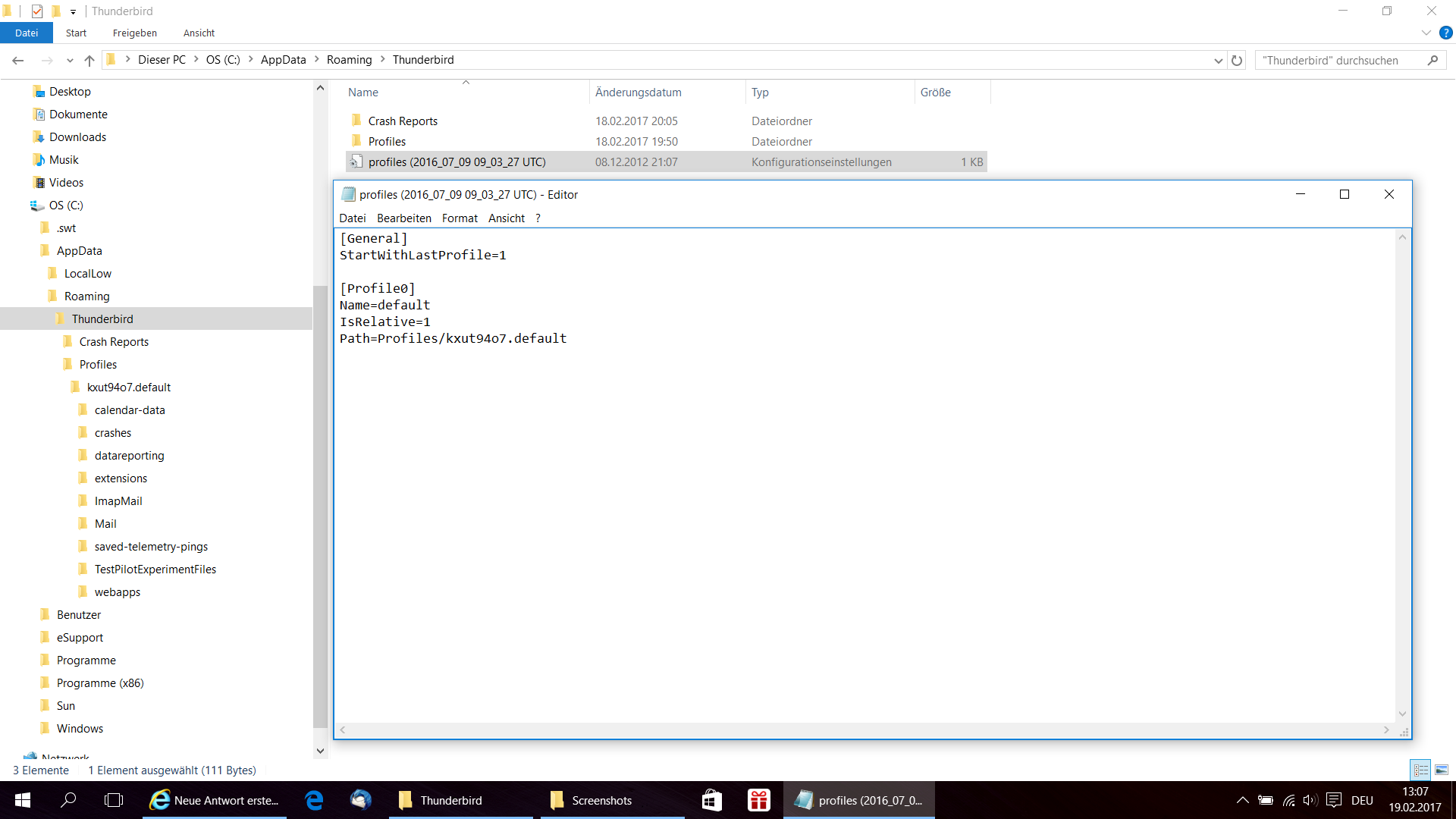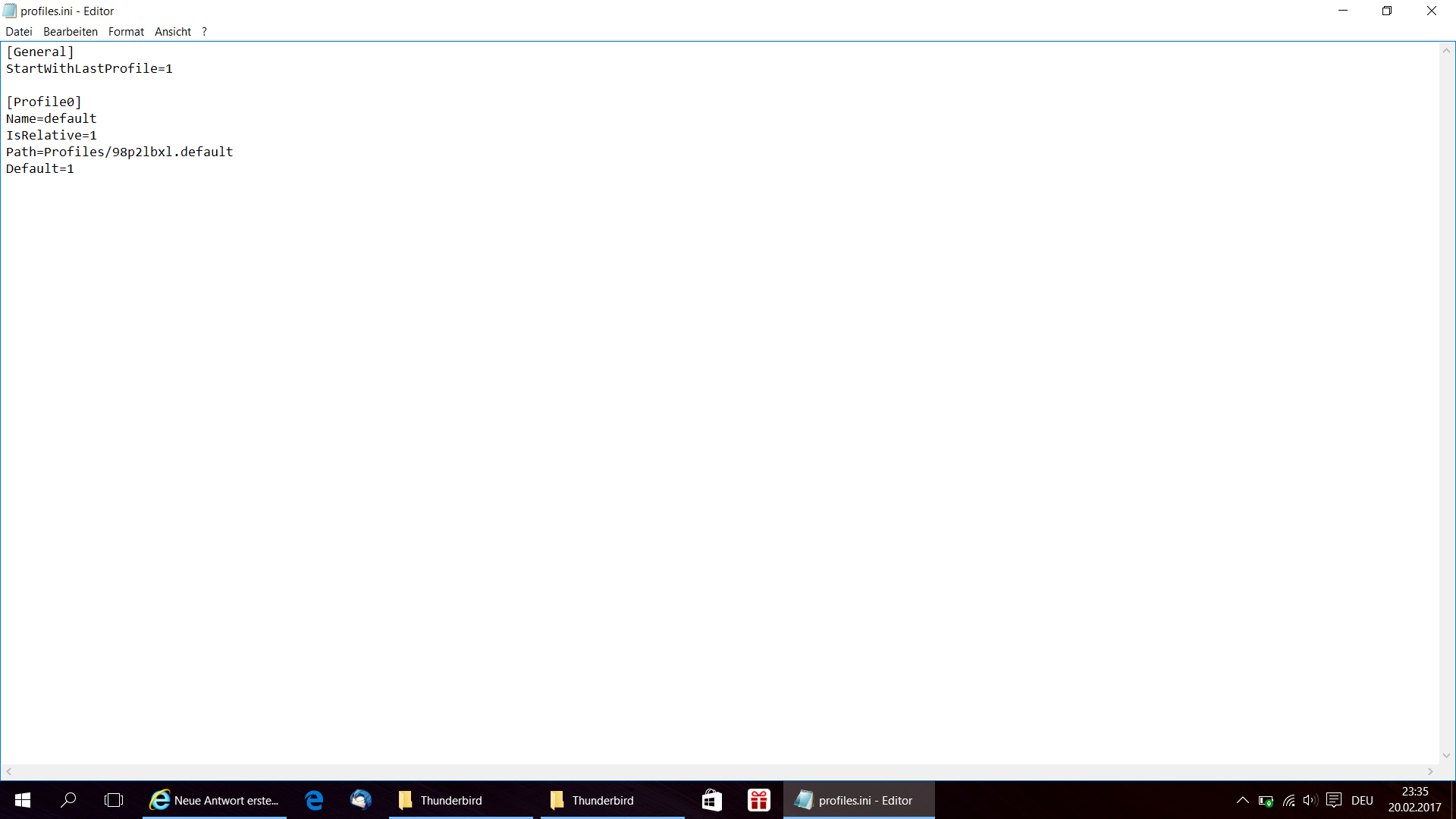 Gehe zurück in den Ordner \Thunderbird\, öffne die Datei "profiles.ini" und kopiere ihren Inhalt.Gruß