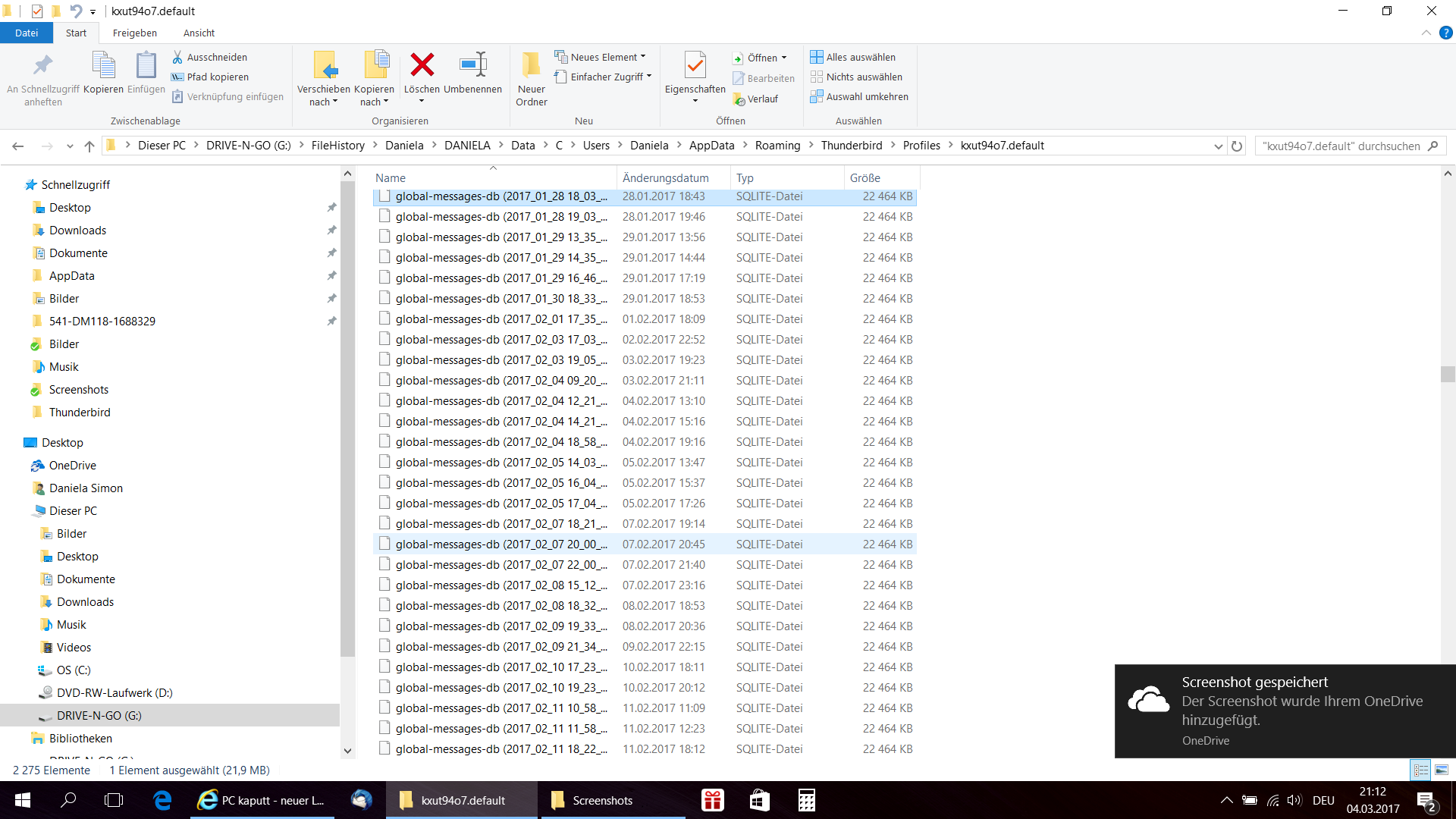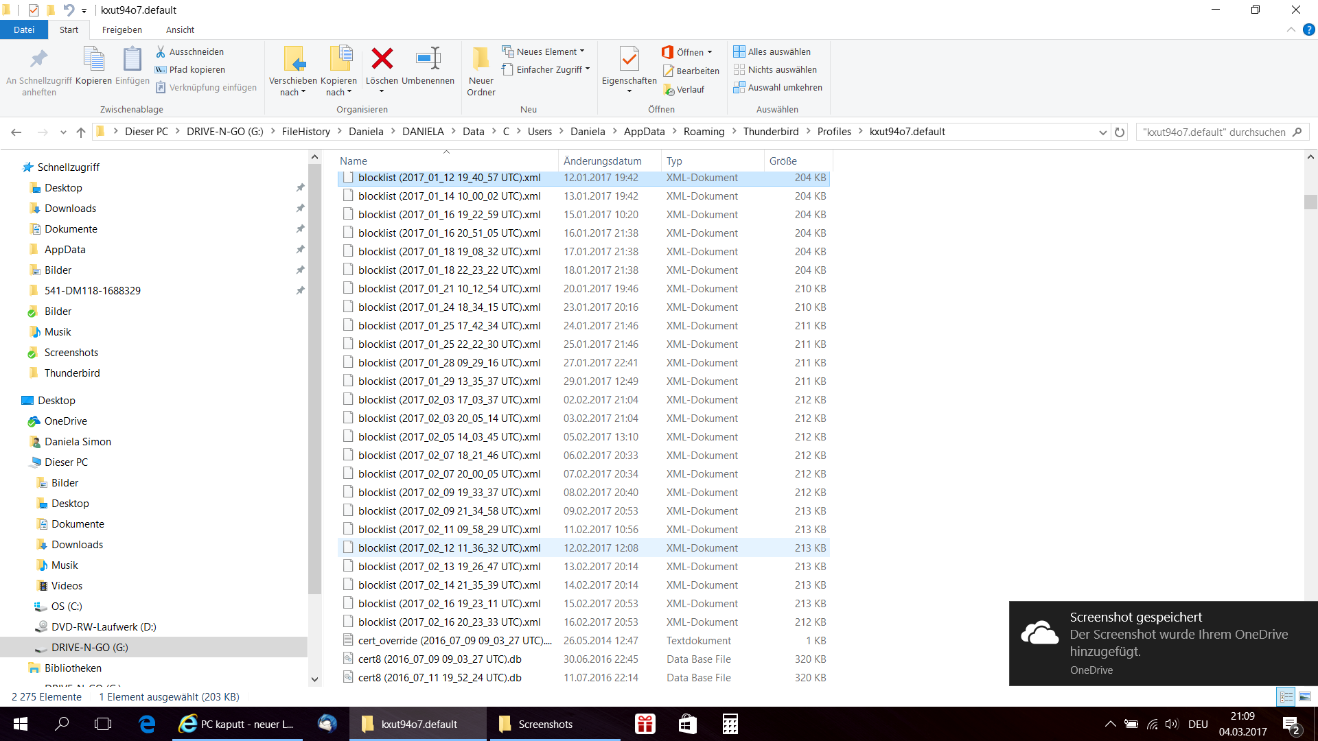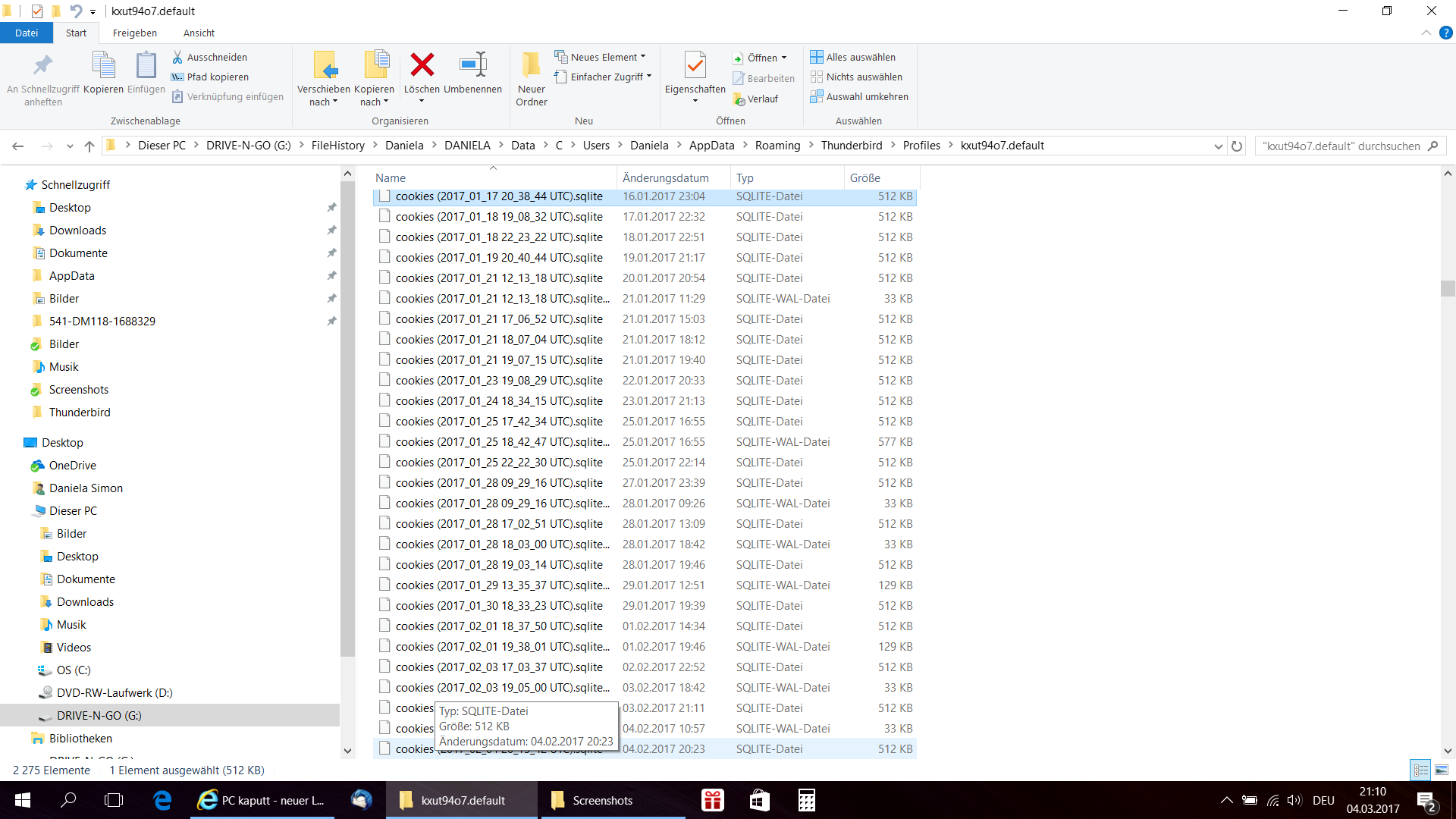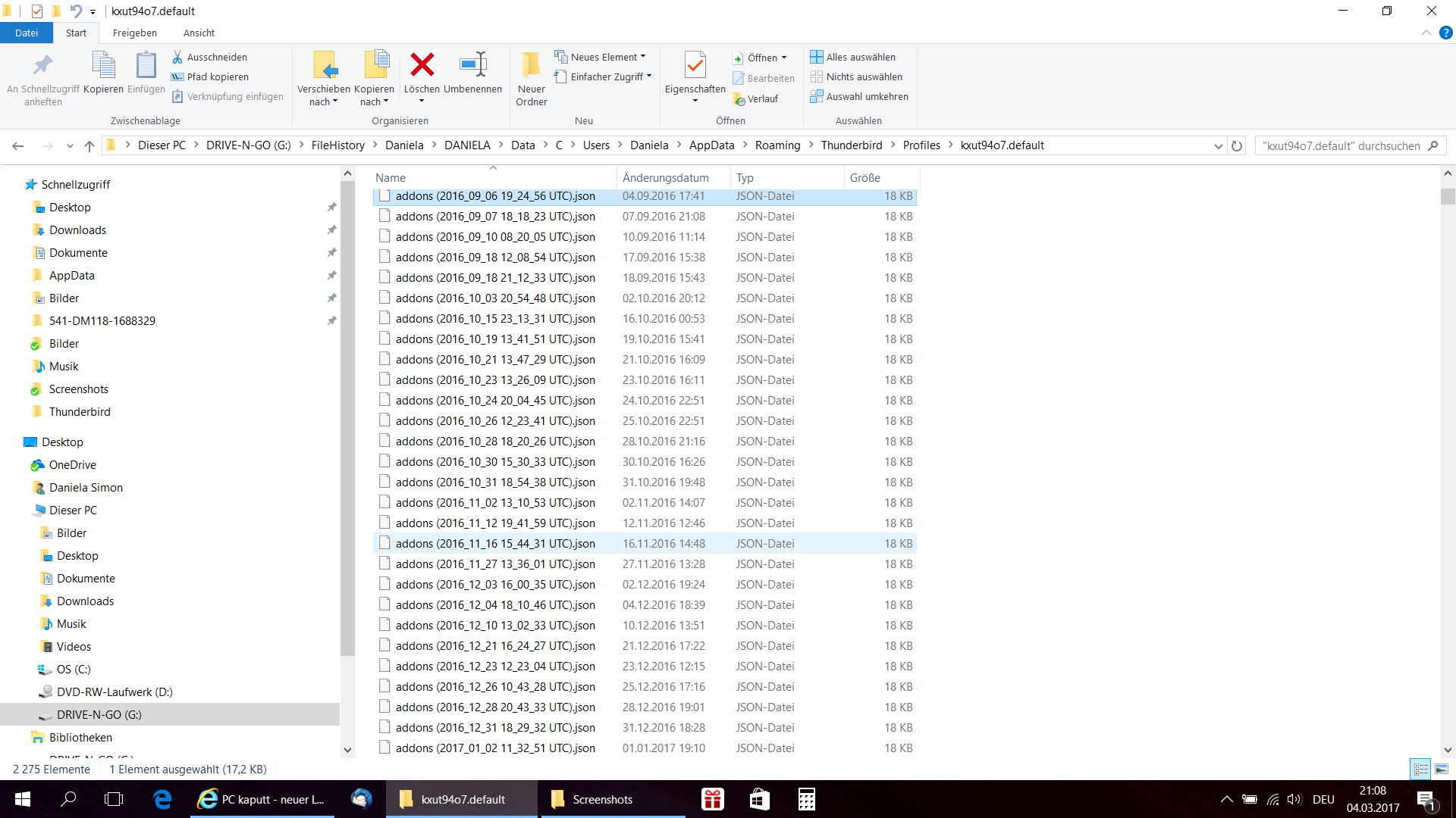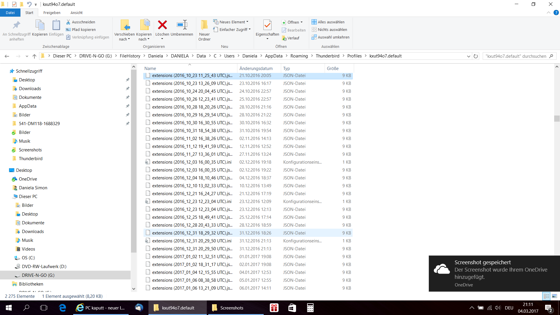 Ja, das Original Backup ist auf einer Externen Festplatte und das Proil heisst "kxut94o7.default". Ich mache mal die Screen shots von der Festplatte. Das Original Backup ist ja aber schon vorhanden auf dem neuen Laptop, nur eben am falschen Ort. Das kam deswegen, weil nicht alle Ordner angezeigt wurden. War so voreingestellt, habe ich mittlerweile geändert.