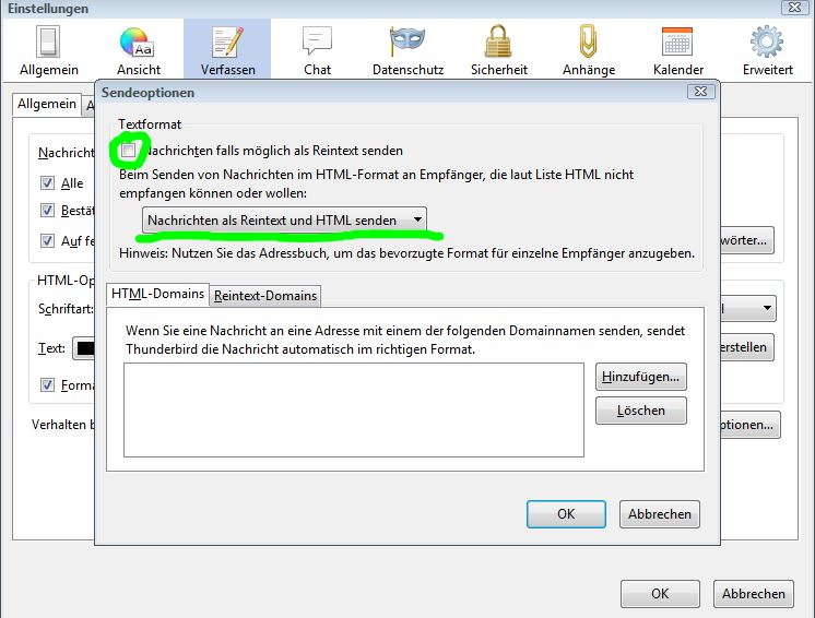 • Von Sendeoption "Automatisch" dauerhaft auf "HTML und Reintext" umstellen