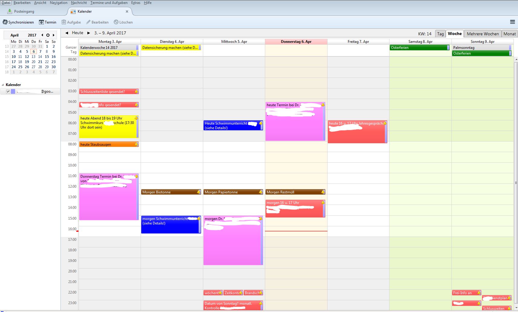 Und mit verschiedenen Kalendern für verschiedene Themenbereiche innerhalb meines HAUPTKLALENDERS zu arbeiten ist mir (noch...) suspekt. Ich will ja die automatische Synchronisation ALLER Termine zwischen zwei Rechnern und Smartphone, egal auf welchem Gerät ich einen Termin eintrage, ändere oder lösche.