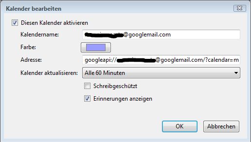 was muss ich da einstellen, damit die Termine tatsächlich auf dem Rechner gespeichert werden, und nicht nur zu Google übetragen und in der Cloude im Google-Calendar eingetragen werden? Bei mir sieht es so aus, wenn ich den in TB aktivierten Google-Kalender auf der linken Seite von TB rechts anklicke und Eigenschaften wähle: