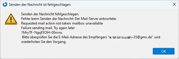 Und zwar adressiert exakt so, wie es im Klartext in der Fehlermeldung ausgewiesen wird. Damit sollte erst mal sichergestellt werden, dass die Mailadresse überhaupt richtig ist und sich nicht etwa ein Tippfehler eingeschlichen hat.