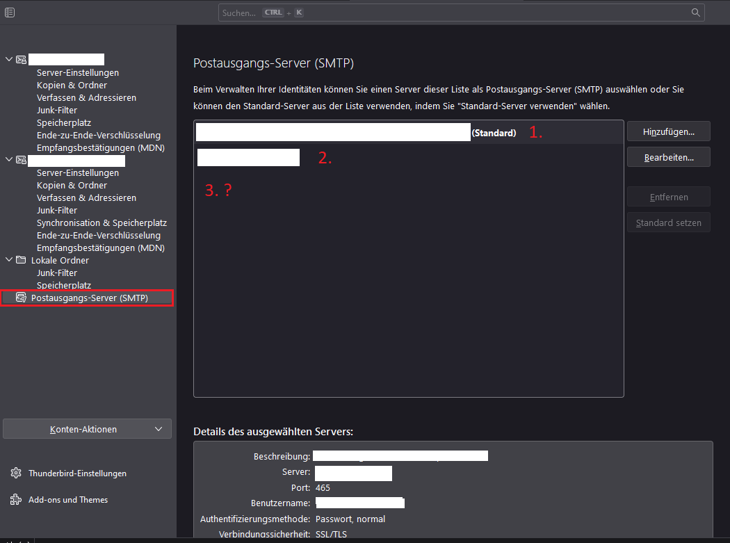 Wenn das erledigt ist, gehts zurück zum jeweiligen Konto, um die Zuordnung des zugehörigen SMTP-Servers vorzunehmen: