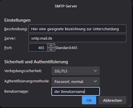 Eine geeignete Bezeichnung der beiden mail.de-SMTP sollte Dir nun hier die Unterscheidung und die richtige Zuordnung ermöglichen.