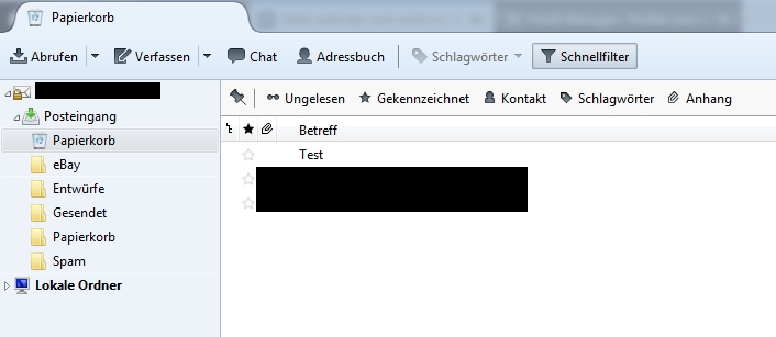 Aktualisiere ich meine Mails in Tb kann ich diese Tesmail generieren und sie ist im Ordner "Trash" zu finden.