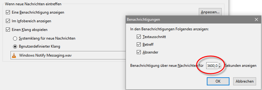 Die habe ich auf die maximal mögliche Anzeigezeit von 3600 Sek. gestellt, zudem bleibt ein Symbol in der Taskleiste stehen, bis ich die neue Mails behandelt habe: