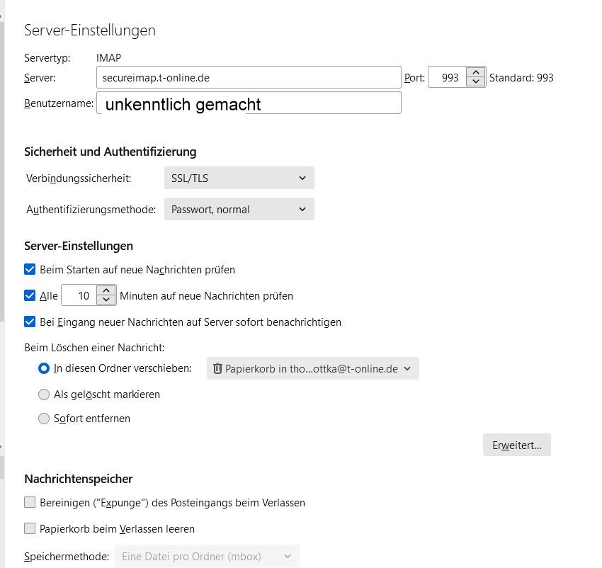 Seit einiger Zeit haben wir Probleme im Thunderbird mit einem(!) T-Online-Konto. Wir haben mehrere T-Online Emailkonten. Alle funktionieren im Thunderbird normal. Das eine, um das es geht, lief seit einiger Zeit immer wieder auf Fehlermeldungen, so dass ein Abrufen und Versenden nicht bzw. nur manchmal möglich war.