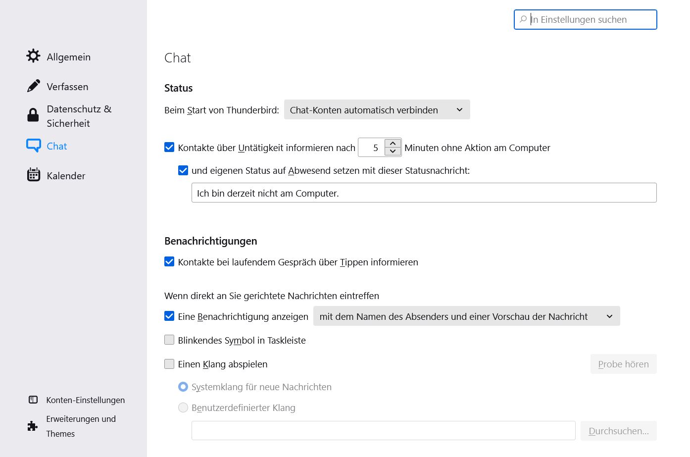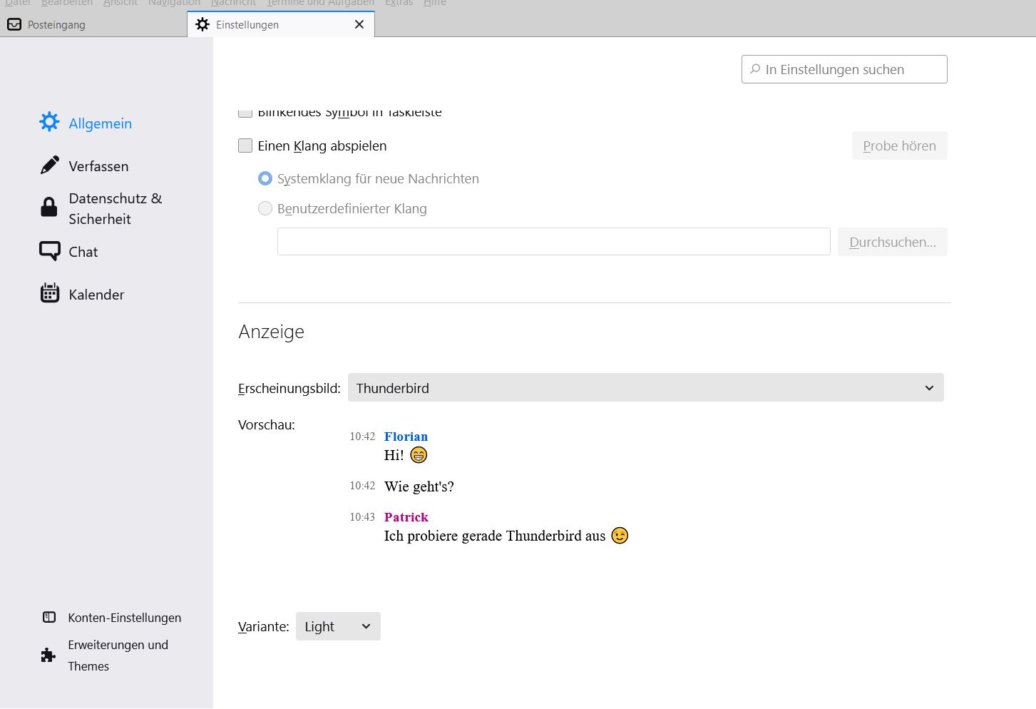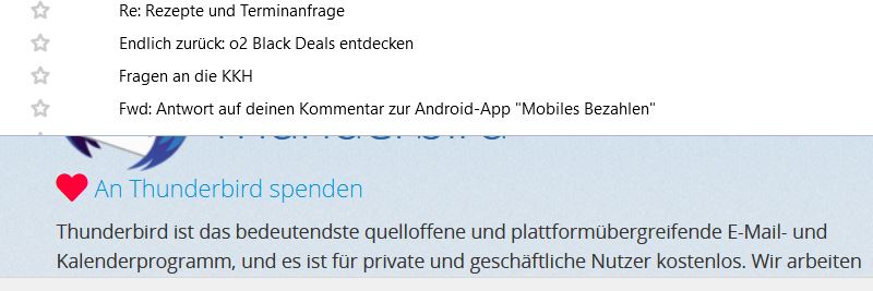 Danke für den schnellen Tipp. Leider funktioniert das mit Allgemein nicht. Allgemein lässt sich nicht anklicken um zu Thunderbird-Startseite zu kommen. Beim ersten anklicken von Einstellungen komme ich jedes mal auch Chat. Wenn ich danach Allgemein anklicke bricht nach einer geraumen Zeit Thunderbird ab. Grüßle Herbert