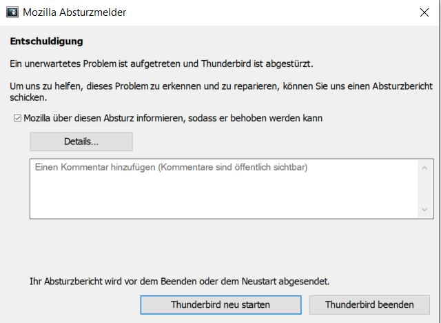 Hallo, ich bitte um Hilfe. Da ich weitestgehend Computerlaie bin habe ich auch Schwierigkeiten das Problems zu beschreiben. Für mich fängt das Problem mit dem benutzen des Forums schon an. Bin ich unter dem richtigen Teil des Forums? Bekomme ich eine Antwort wenn jemand auf meine Fragen antwortet? Vor kurzem hat noch alles wunderbar funktioniert. Da ich Thunderbird nicht jeden Tag benutze ist es mir erst jetzt aufgefallen wo ich ein wichtiges Dokument versenden wollte. Kann seit kurzem angehängte PDF Files vor dem Versenden nicht öffnen. Andere Anhänge lassen sich problemlos öffnen. Wenn ich vor kurzem Anhänge gedrückt habe standen sie unter Anhänge. Jetzt, wenn ich auf Anhänge drücke werden sie unten in eine Leiste gestellt. Öffne ich sie stehen sie unter Entwürfe. Schließe ich Entwürfe steht die Mail zum versenden. Unter Entwürfe stehen auch die anderen PDF Files die ich davor als Anhang eingestellt habe. Auch nach Google Suche komme ich nicht weiter. Gehe ich auf Allgemein und möchte auf Dateien und Anhänge scrollen bricht Thunderbird ab. Öffne ich Einstellungen wieder, steht die Anwendung auf Chat. Das Spiel kann unendlich wiederholt werden.