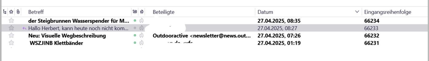 Hallo zusammen, evtl. habe ich es denk Eurer Hilfe mit der Sortierung geschafft. Für mich ist das einfach schwierig. Eigentlich möchte ich nur Mails schreiben und empfangen. Diese in einem Ordner ablegen.