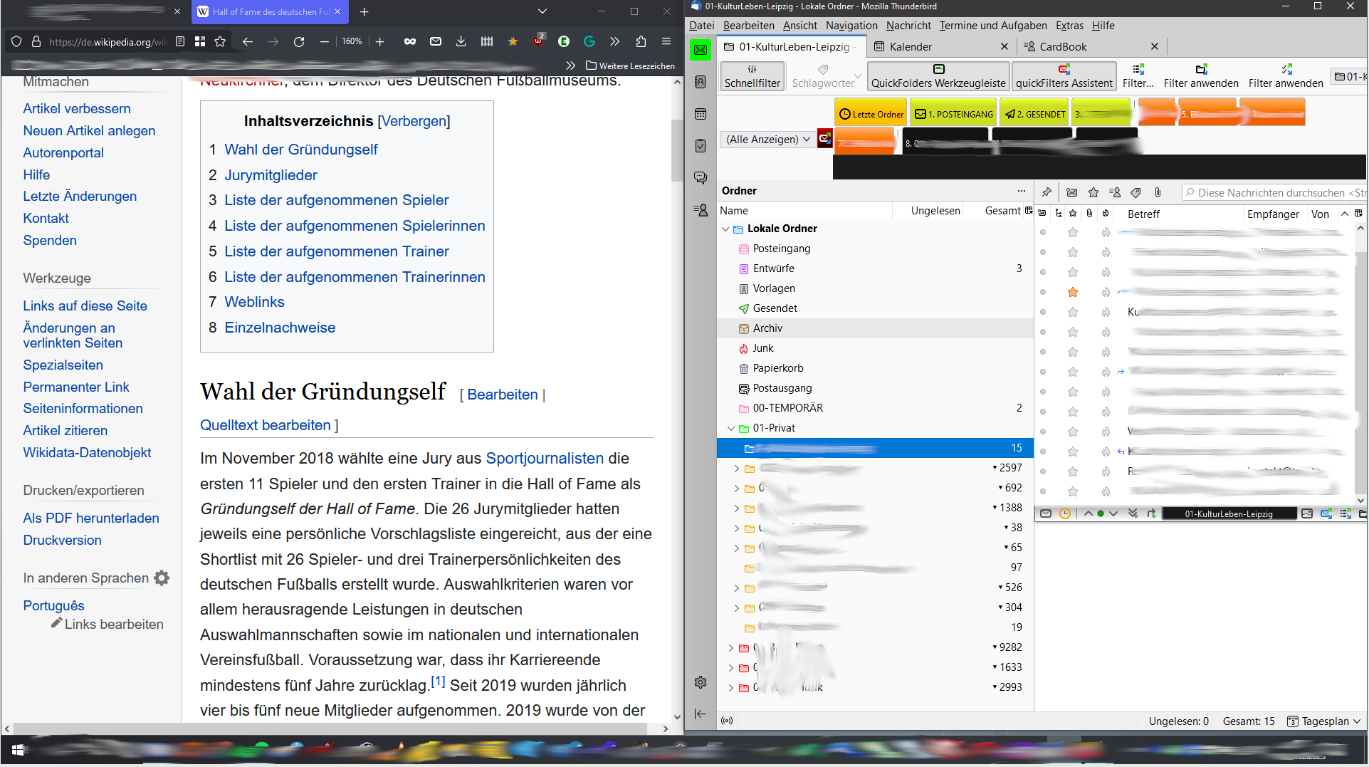 Links in Thunderbird der Ordnerbaum, rechts das unvollständige Mail-Feld. Der Button für das Abrufen ist überhaupt nicht erreichbar, nur wenn ich Thunderbird maximiere. Aber dann könnte ich auch ganz auf die Snap-Funktion verzichten.