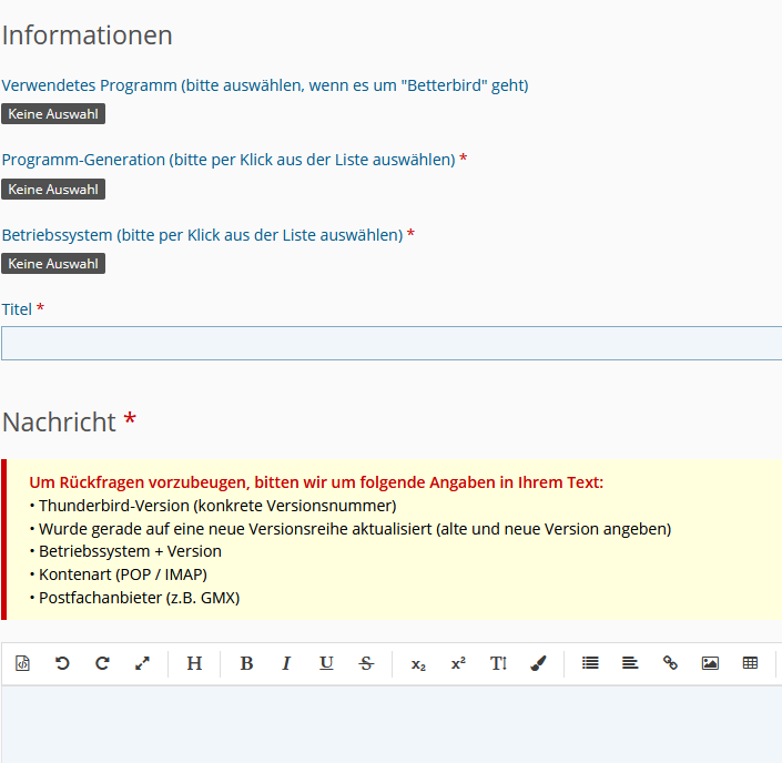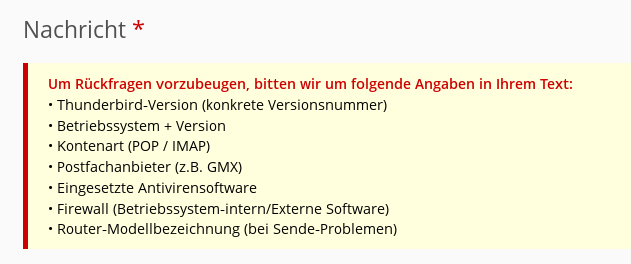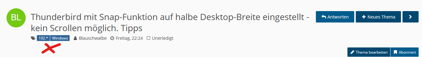 Ich muss ehrlicherweise sagen, dass es mir erst jetzt auffällt. Zumindest die Thunderbird-Version und das verwendete Betriebssystem ist wohl immer links oben vermerkt, wenn der Threadstarter die Eingangsfragen beantwortet.