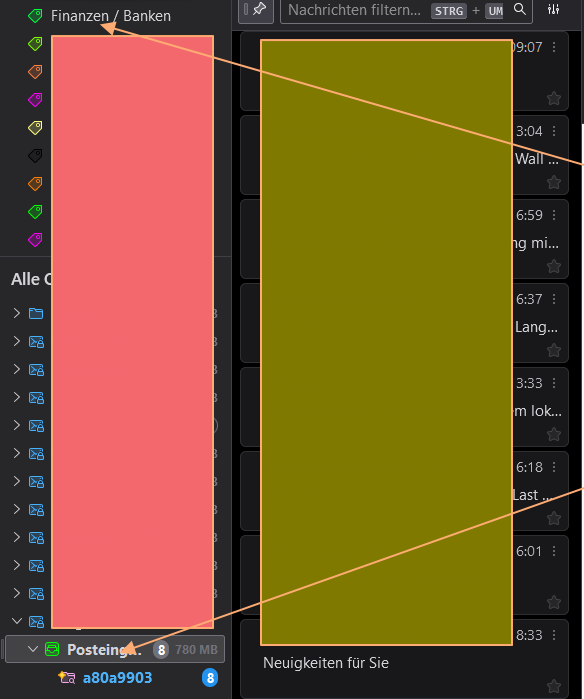 - dann erfolgt rechts für 0,5 sec die Anzeige eder ntsprechenden Mails mit dem Schlagwort Finanzen / Banken