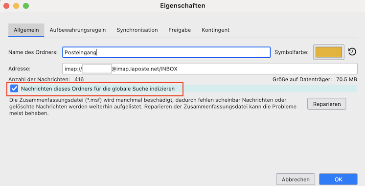 Dazu müssen generell die globale Suchfunktion in den Einstellungen > Allgemein und auch die Indizierung eines individuellen Ordners für die globale Suche in den "Eigenschaften" des Ordners aktiviert sein. Standardmäßig ist das der Fall. -