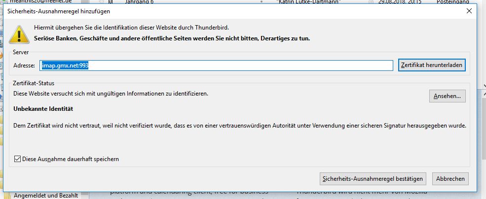 Beim Einrichten meines neuen PCs stoße ich mit Thunderbird auf Probleme. Wenn ich versuche meine GMX Adresse einzurichten werde ich ständig nach einer "Sicherheitsausnahmeregel" gefragt die ich bestätigen soll. Tue ich dies, kommt das Fenster nur wieder. Da ich vor wenigen Wochen ohne Probleme das Konto auf meinem Tablet habe einrichten können, bin ich etwas verwirrt. Vielleicht kann mir hier geholfen werden.
