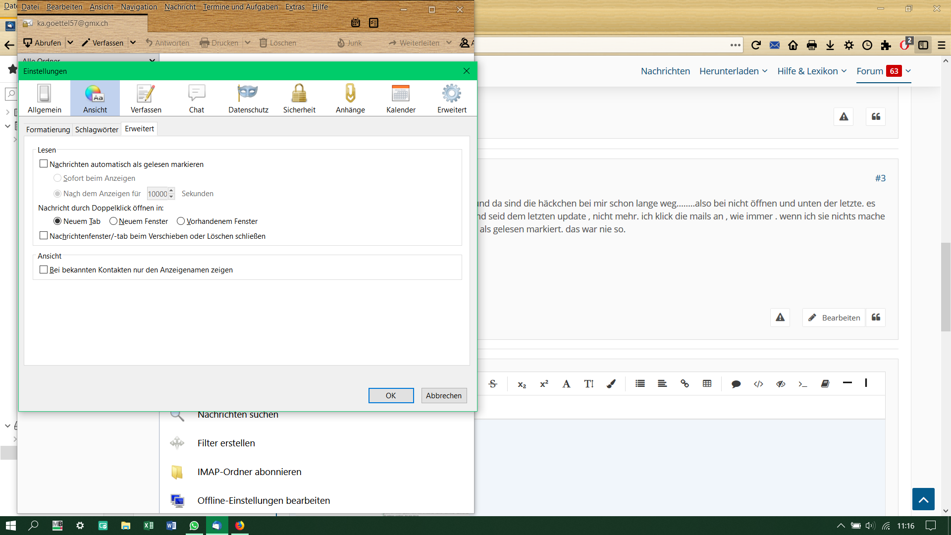 hallo in die gruppe.............habe hier schon viele tipps gelesen. ich habe auch vieles befolgt, wie folgendes : trotz den beiden entfernten häckchen, stellen sich meine emails nach ca. 1 minute auf gelesen um . ich möchte das nicht. was gibt es noch für tipps , die ich befolgen kann. weiss momentan nicht weiter und es stört mich. schon mal danke in die runde......