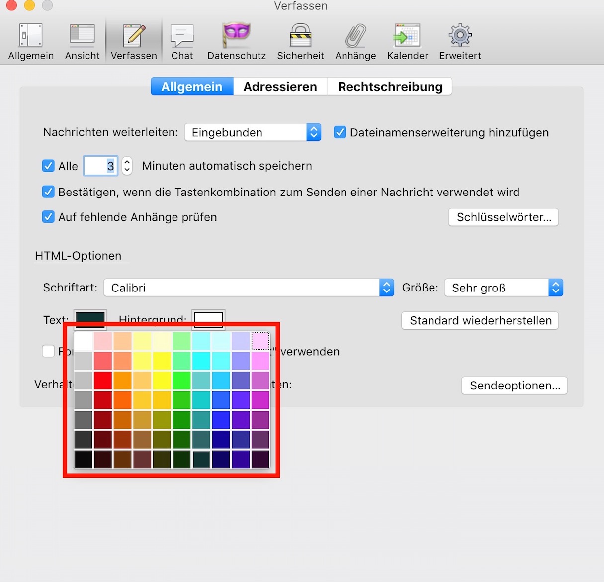 Danke mrb , ich möchte bloß meine Standardschriftfarbe für alle Konten und für alle zu verfassenden Nachrichten auf eine bestimmte Farbe ändern.