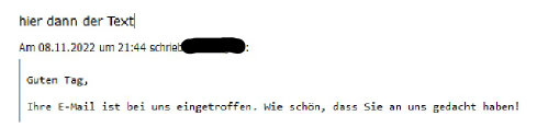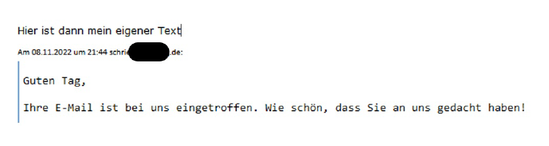 In dem Beispiel ist mein eigener Text dann immerhin so groß wie der in der ursprünglichen Mail, auf die ich geantwortet habe. Wenn es ganz blöd läuft ist mein eigener Text aber auch nur so groß wie hier "Am 08.11.2022 ..." Es kommt auch vor, dass der Text der ursprünglichen Mail schon so klein ist wie "Am 08.11.2022"
